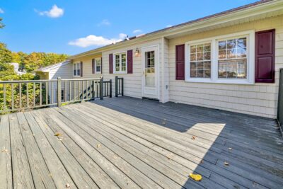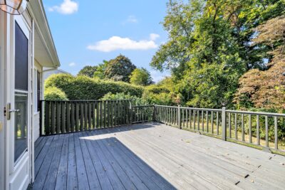 The spacious living room, anchored by a classic brick fireplace and adjacent to the bay window, flows seamlessly into the dining room, creating an open, airy feel that’s ideal for everyday living or holiday entertaining. The kitchen features timeless wood cabinetry, tile backsplash, a skylight, glass cabinetry, eating area, and access to the back deck overlooking the private backyard, offering an easy connection between indoor and outdoor living.