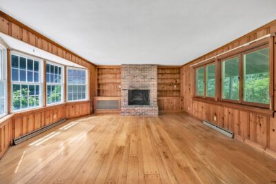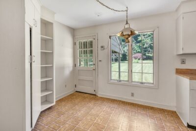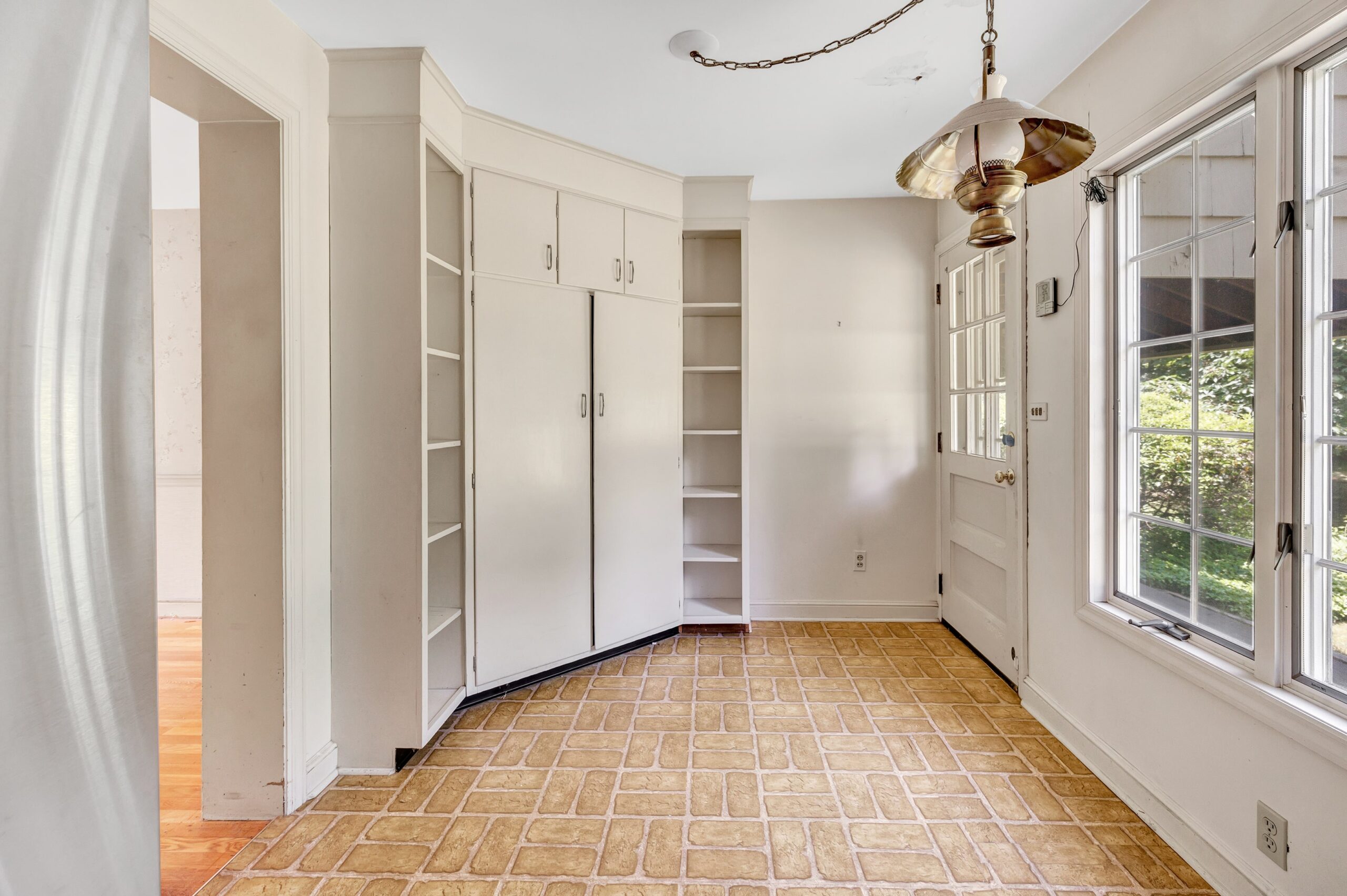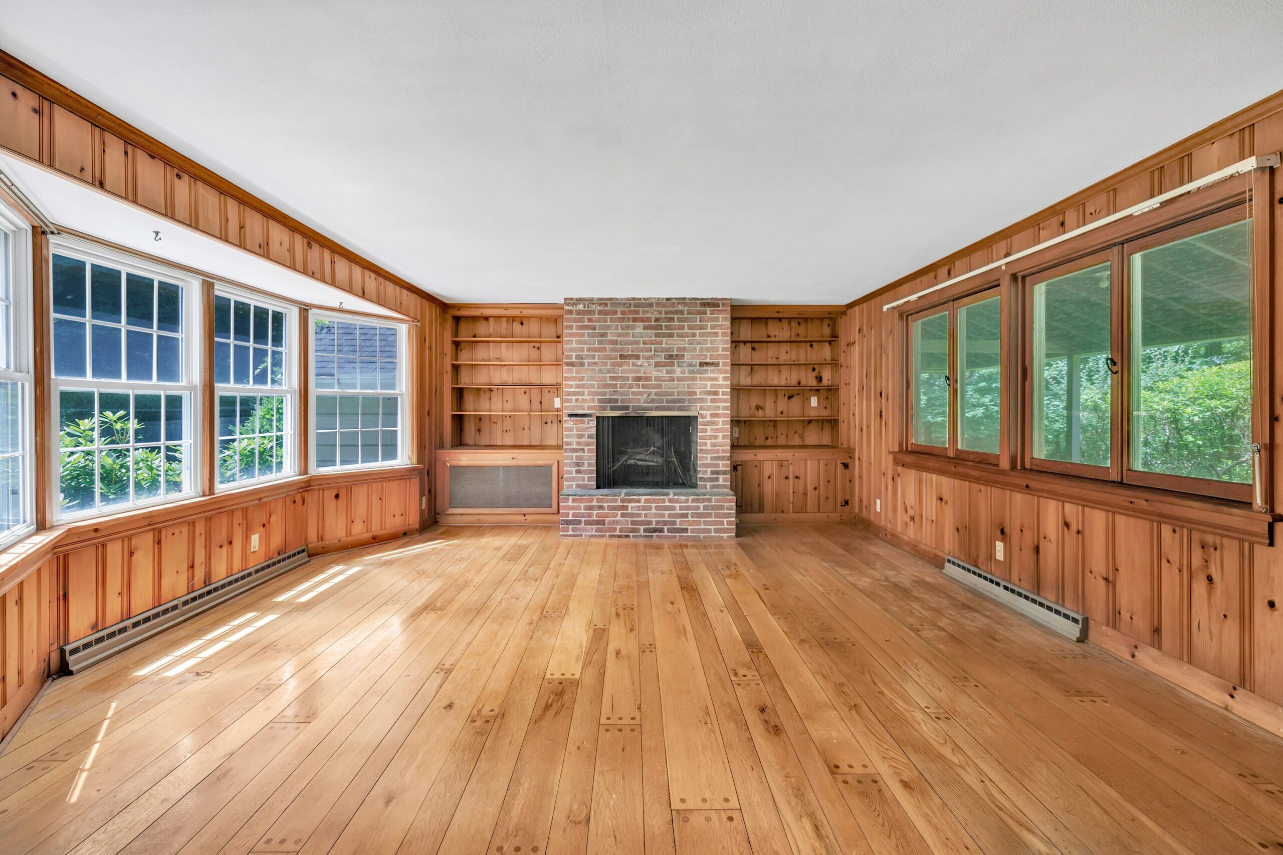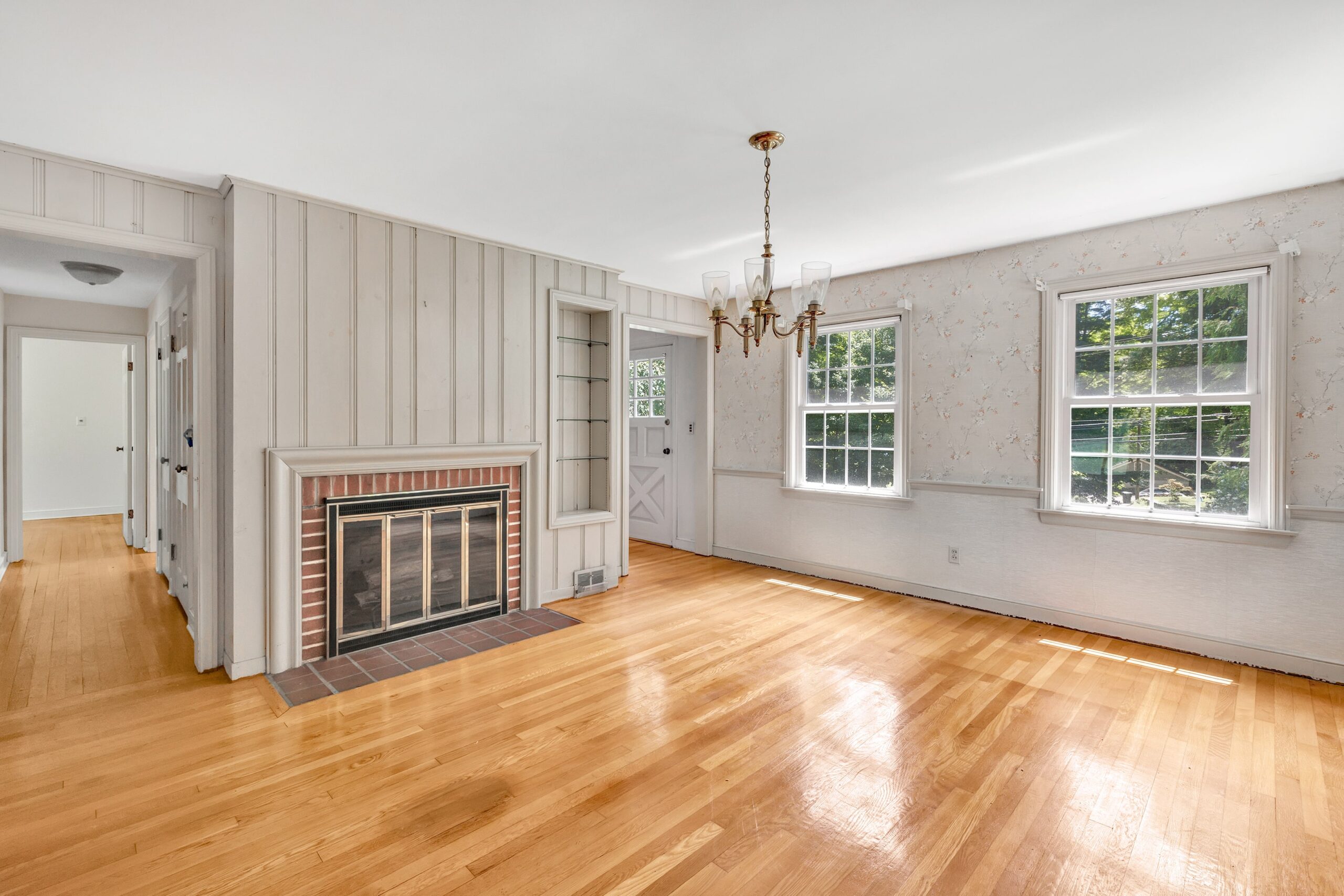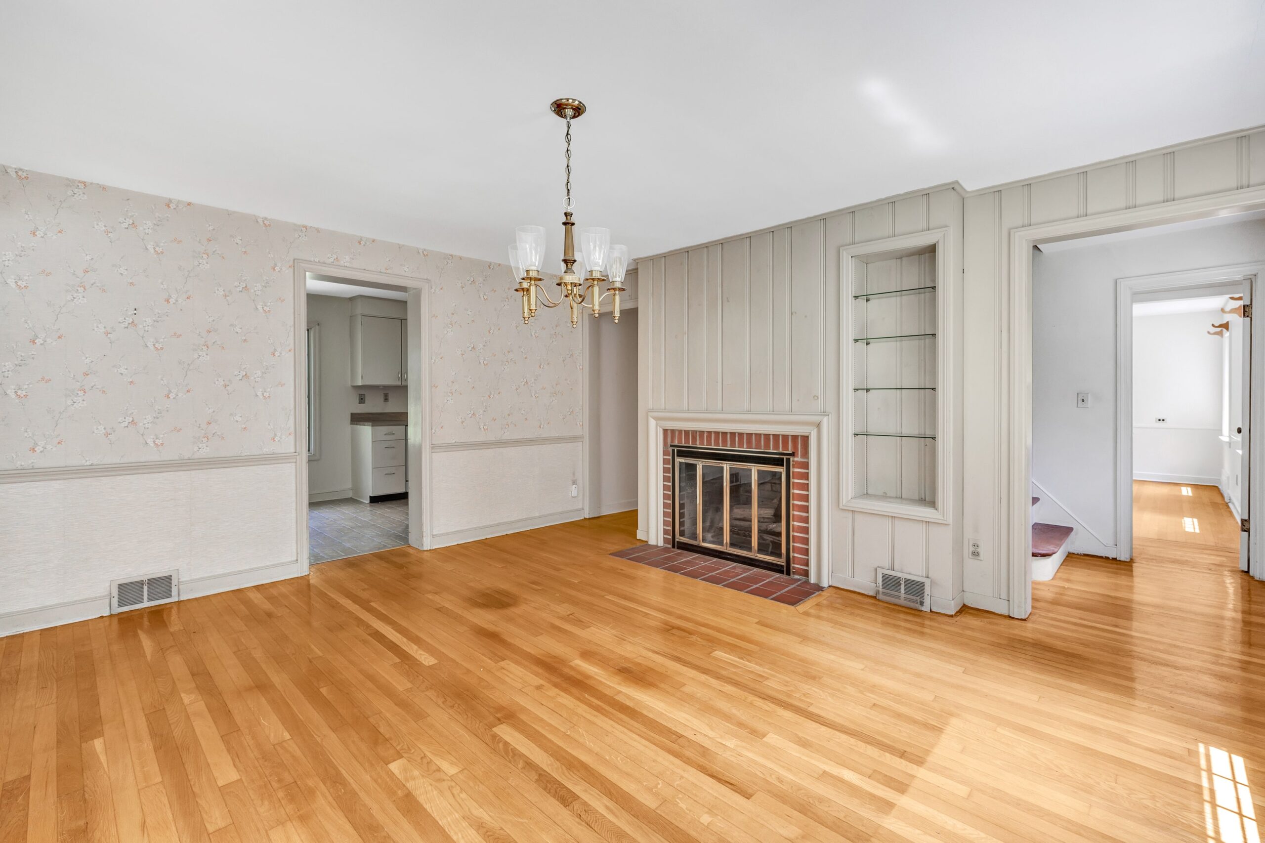 Inside, the front foyer is flanked by the formal dining room and living room/bedroom. The dining room features a fireplace, built-ins, and a chair rail and is the perfect size to host all kinds of gatherings and holiday meals. Pass through the dining room to the kitchen which is awaiting your personal touch, with views and access to the patio and sprawling yard beyond. The oversized, sun-filled family room has wide plank floors, built-in bookshelves, a wood-burning brick fireplace, a bay window overlooking the front yard and Dutch door. Continuing to the other side of the house, two bedrooms and a full bathroom complete the main level. On the second floor, you'll find two bedrooms and a full bathroom with eye-catching wallpaper, plus a walk-in closet and additional storage in the eaves.