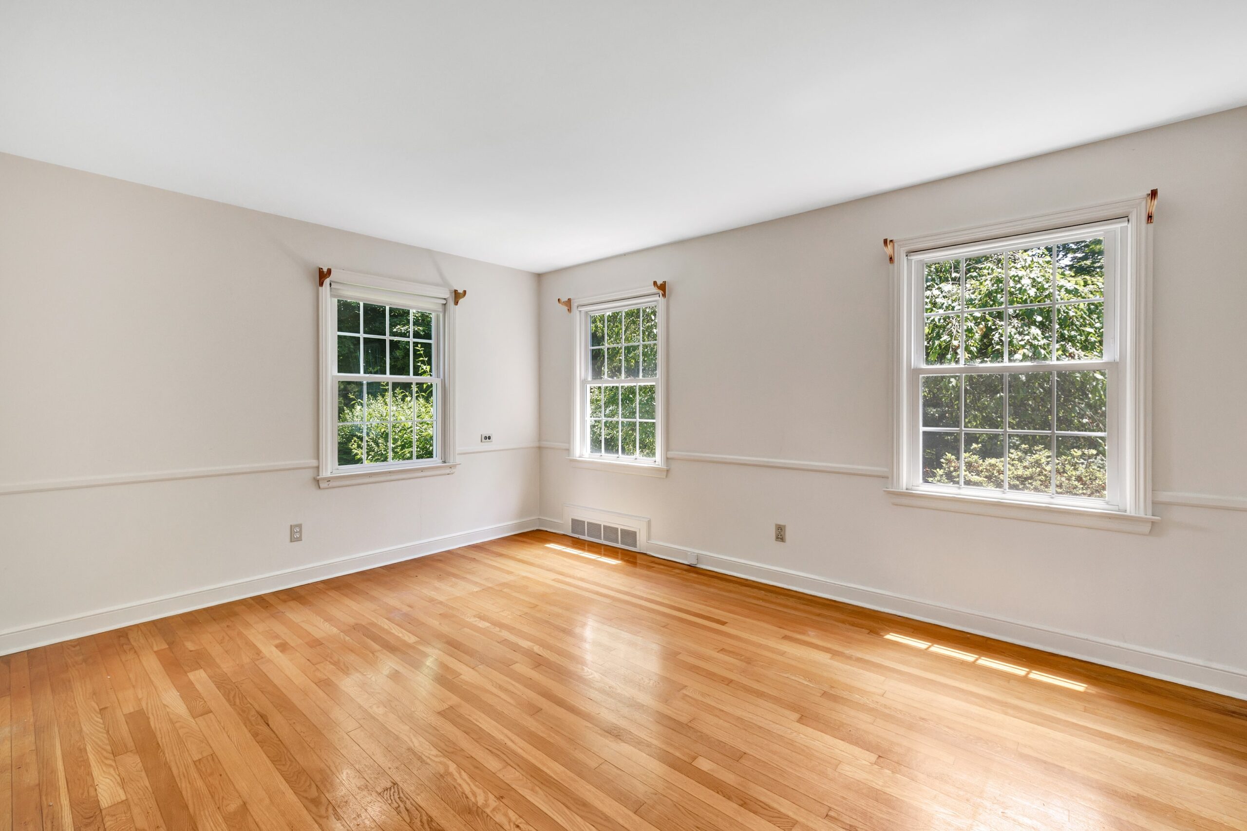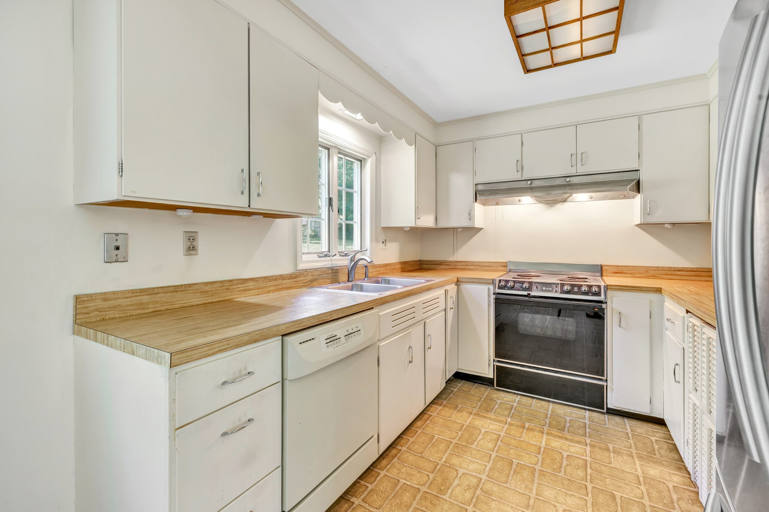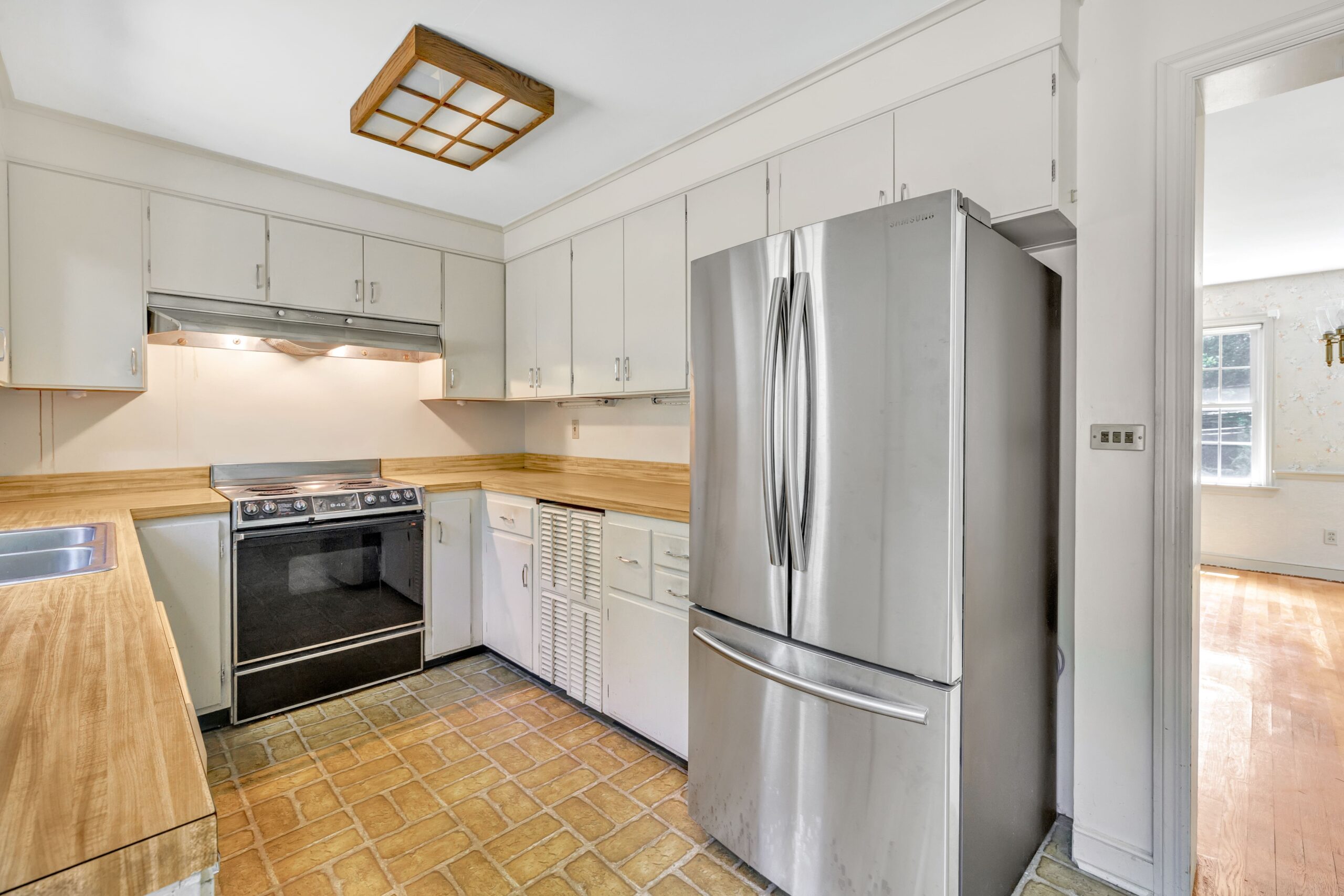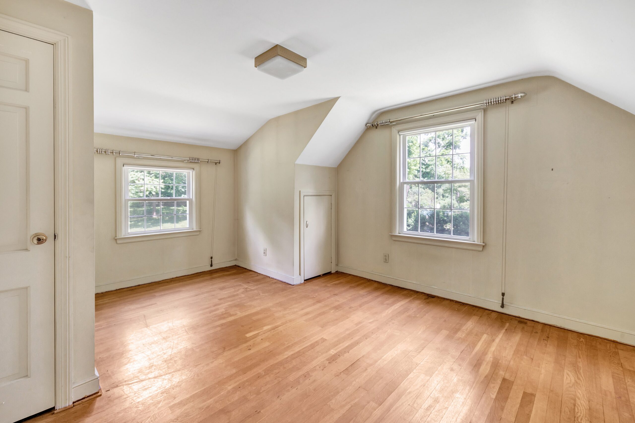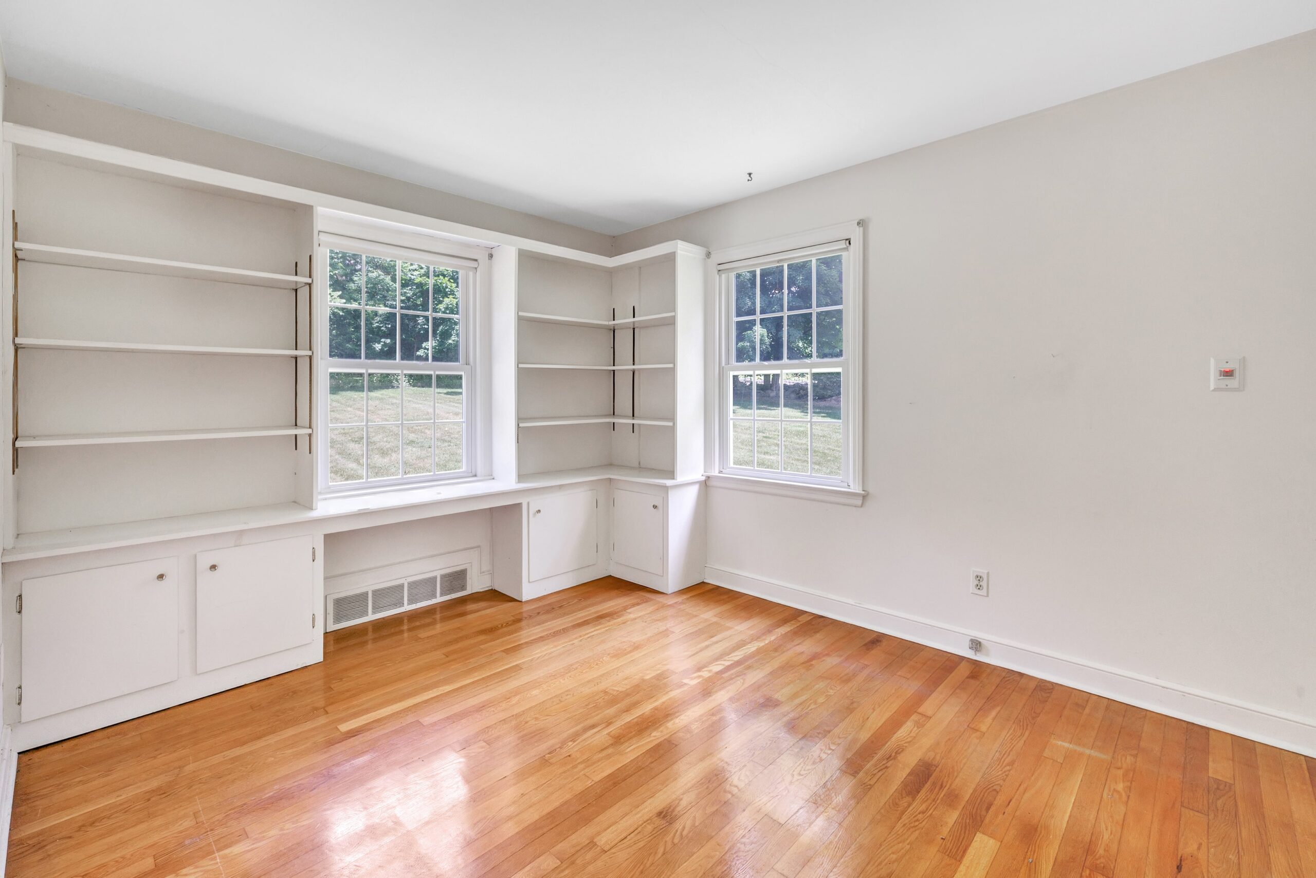 Inside, the front foyer is flanked by the formal dining room and living room/bedroom. The dining room features a fireplace, built-ins, and a chair rail and is the perfect size to host all kinds of gatherings and holiday meals. Pass through the dining room to the kitchen which is awaiting your personal touch, with views and access to the patio and sprawling yard beyond. The oversized, sun-filled family room has wide plank floors, built-in bookshelves, a wood-burning brick fireplace, a bay window overlooking the front yard and Dutch door. Continuing to the other side of the house, two bedrooms and a full bathroom complete the main level. On the second floor, you'll find two bedrooms and a full bathroom with eye-catching wallpaper, plus a walk-in closet and additional storage in the eaves.
