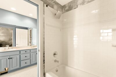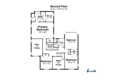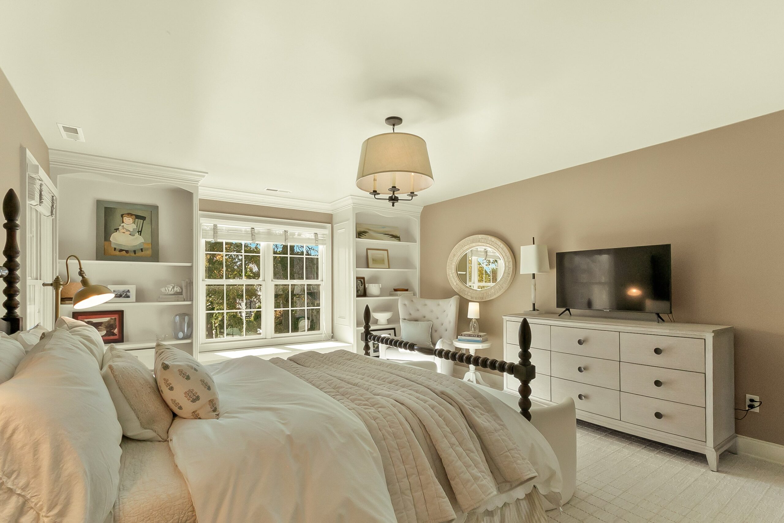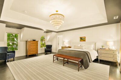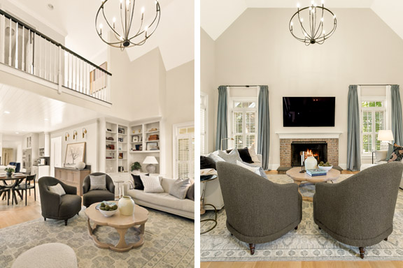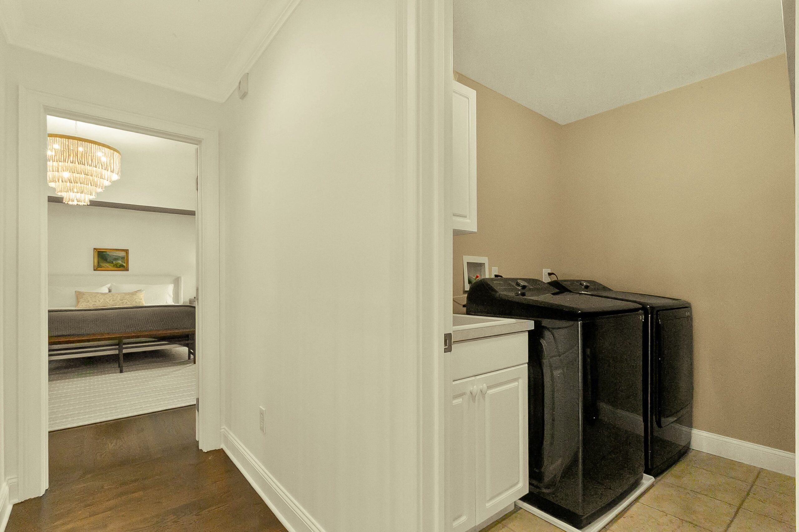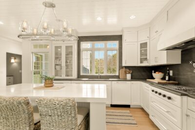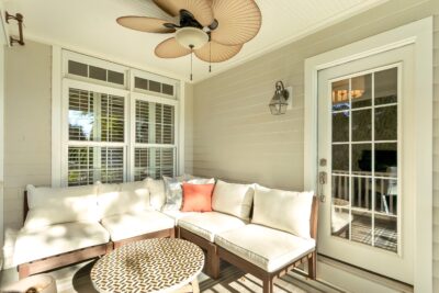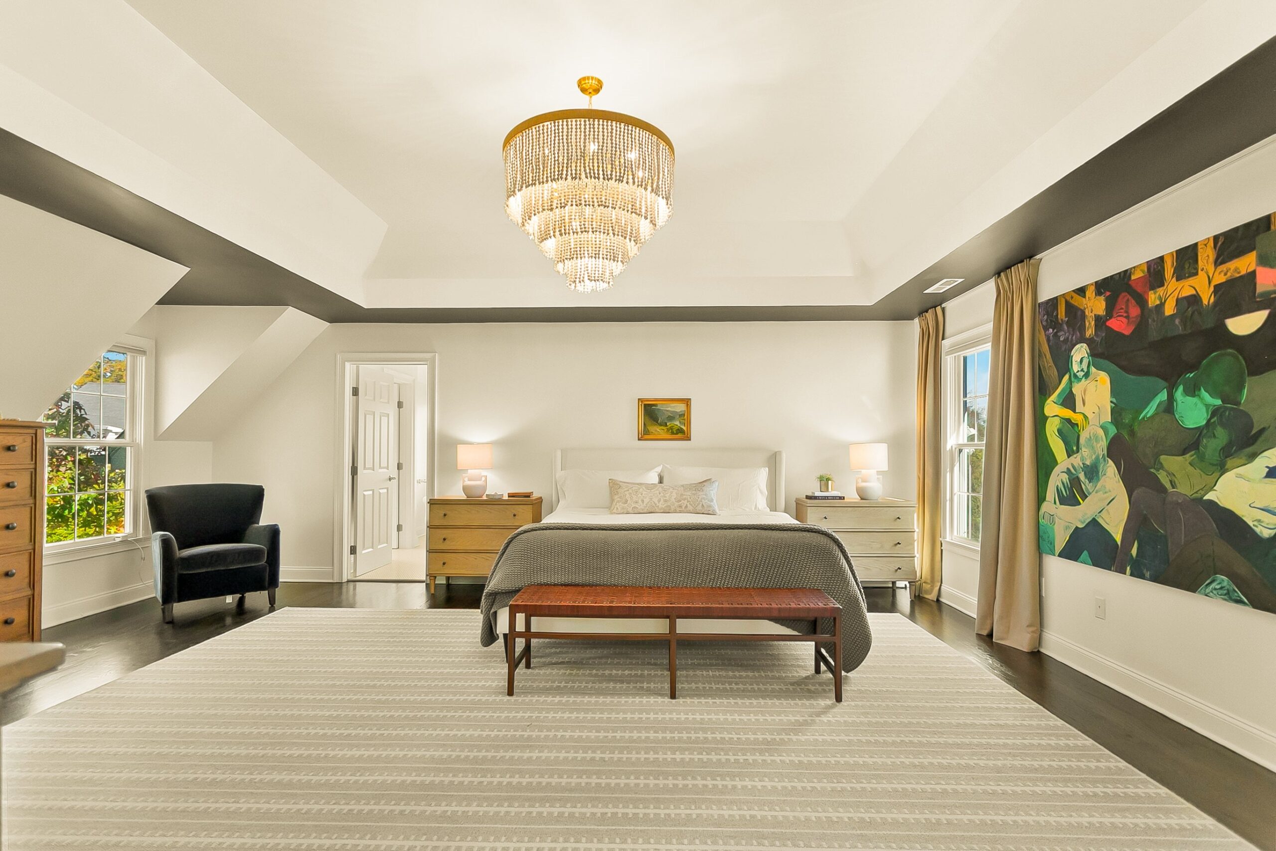 The flatweave stair runner leads you upstairs where you'll find four spacious bedrooms, two full bathrooms, and the laundry room. The catwalk overlooking the family room below leads to the private primary suite - a calming sanctuary with coastal breezes drifting in through the windows. This expansive room is detailed with a tray ceiling accented by a stunning chandelier. The spa-like bathroom features penny tile floors, double vanity, private commode, a soaking tub with hand-dipped fixtures, and access to one of two walk-in closets.