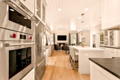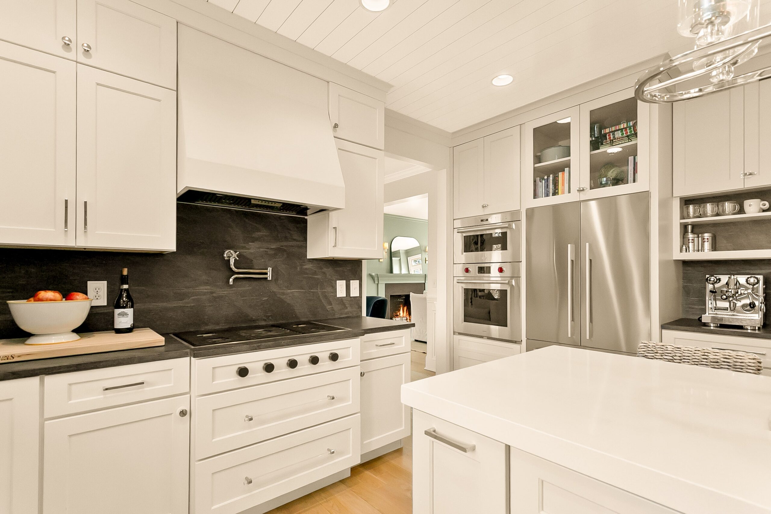 At this home's heart lies the eat-in kitchen, equally suited for casual breakfasts or large entertaining. Stainless steel Wolf appliances, Waterworks fixtures, a pot filler, white cabinetry accented by seeded glass detailing, honed Pietra Cardosa stone countertops, and eye-catching shiplap ceiling ground the space, while a quartz-topped island with storage and seating creates the perfect gathering place. A built-in buffet with the same stunning stone countertops provides an extra place for prized artwork and dishes.