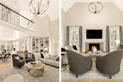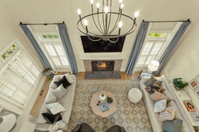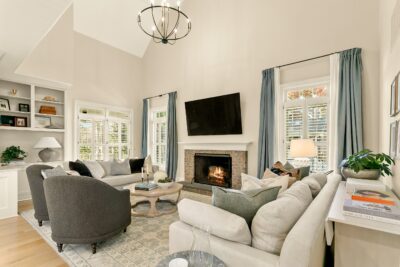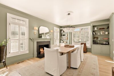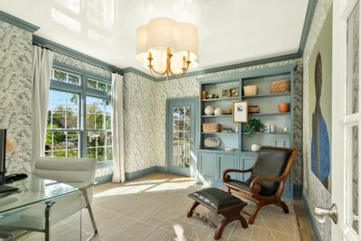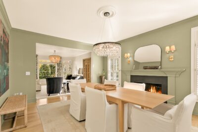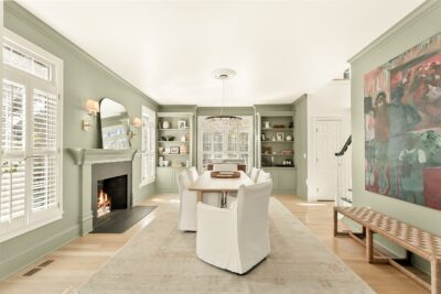 From the second you step into the two story foyer, you’re greeted by superior craftsmanship and character at every turn. Every space feels intentional - from the private office with built-in cabinetry, high-gloss ceiling, chic wallpaper, and a side porch, to the inviting dining room with a wood-burning fireplace and sparkling chandelier, to the serene living room where windows frame picture-perfect views of the lush foliage and the backyard oasis. The striking beaded chandelier adds a whimsical touch to this formal space.