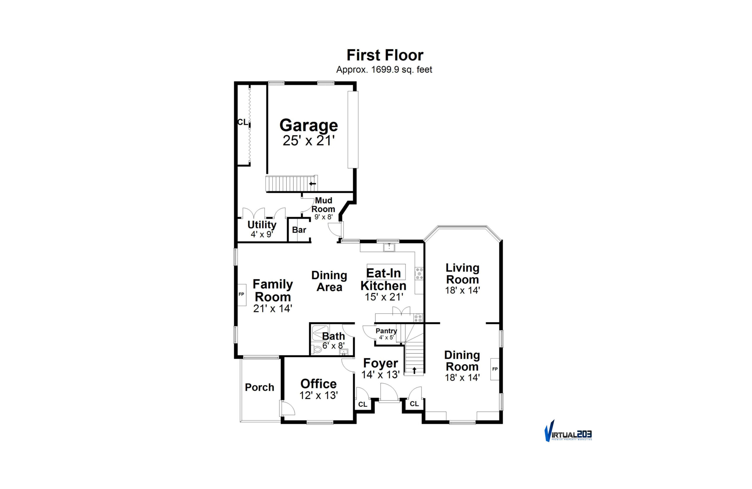 The adjoining breakfast area opens to the dramatic two-story family room, where the vaulted ceiling, brick fireplace, and built-in shelves create a space both airy and intimate. A bar and beverage nook, framed by an arched doorway, adds a layer of easy elegance for entertaining between both indoor and outdoor spaces, while the Dutch door to the backyard adds to the charm of this space. A full bathroom completes the first floor.