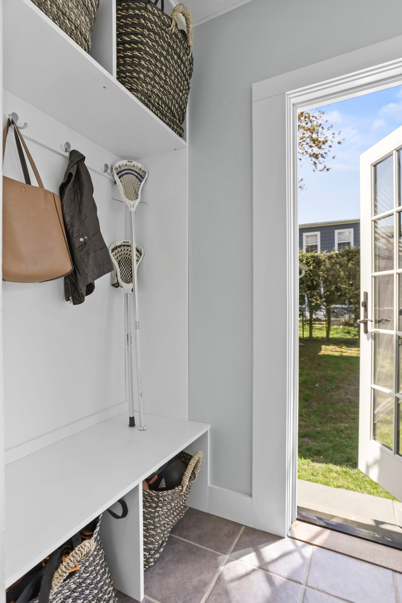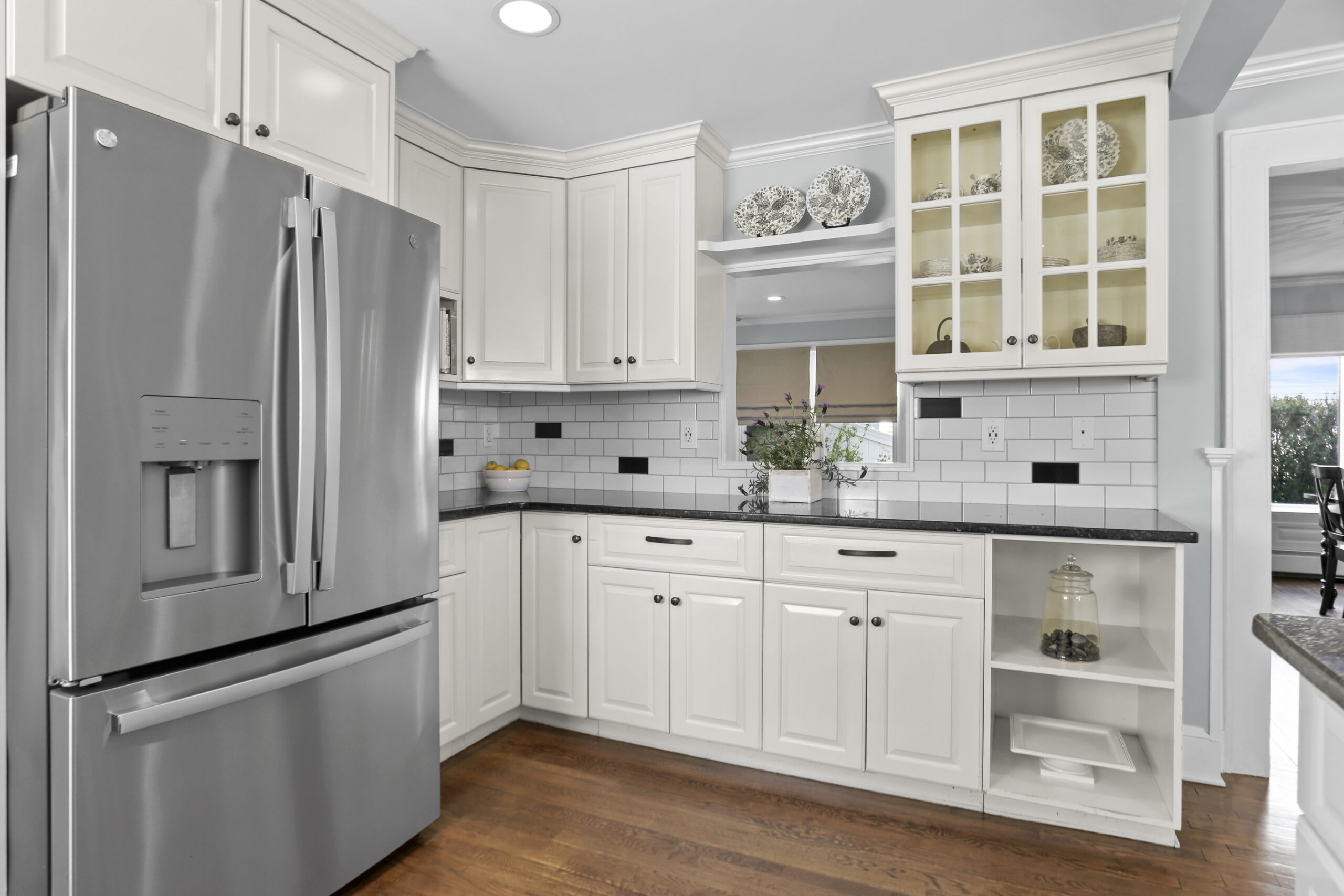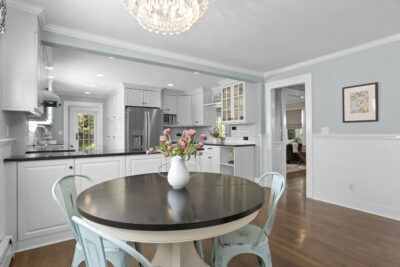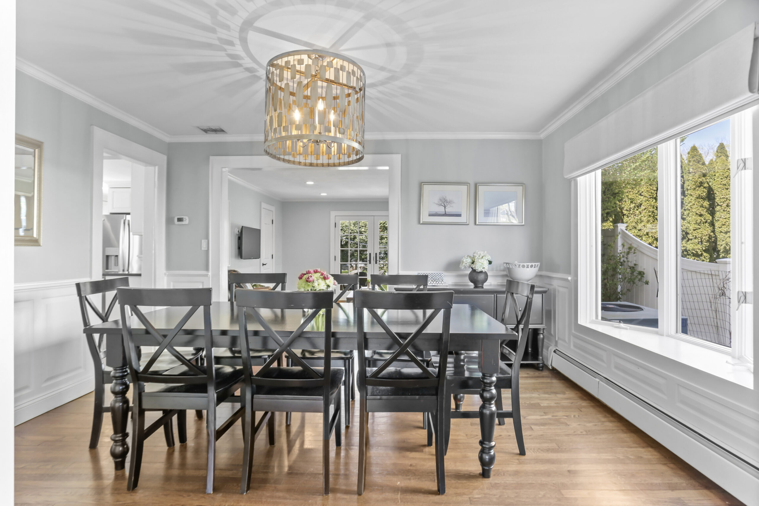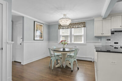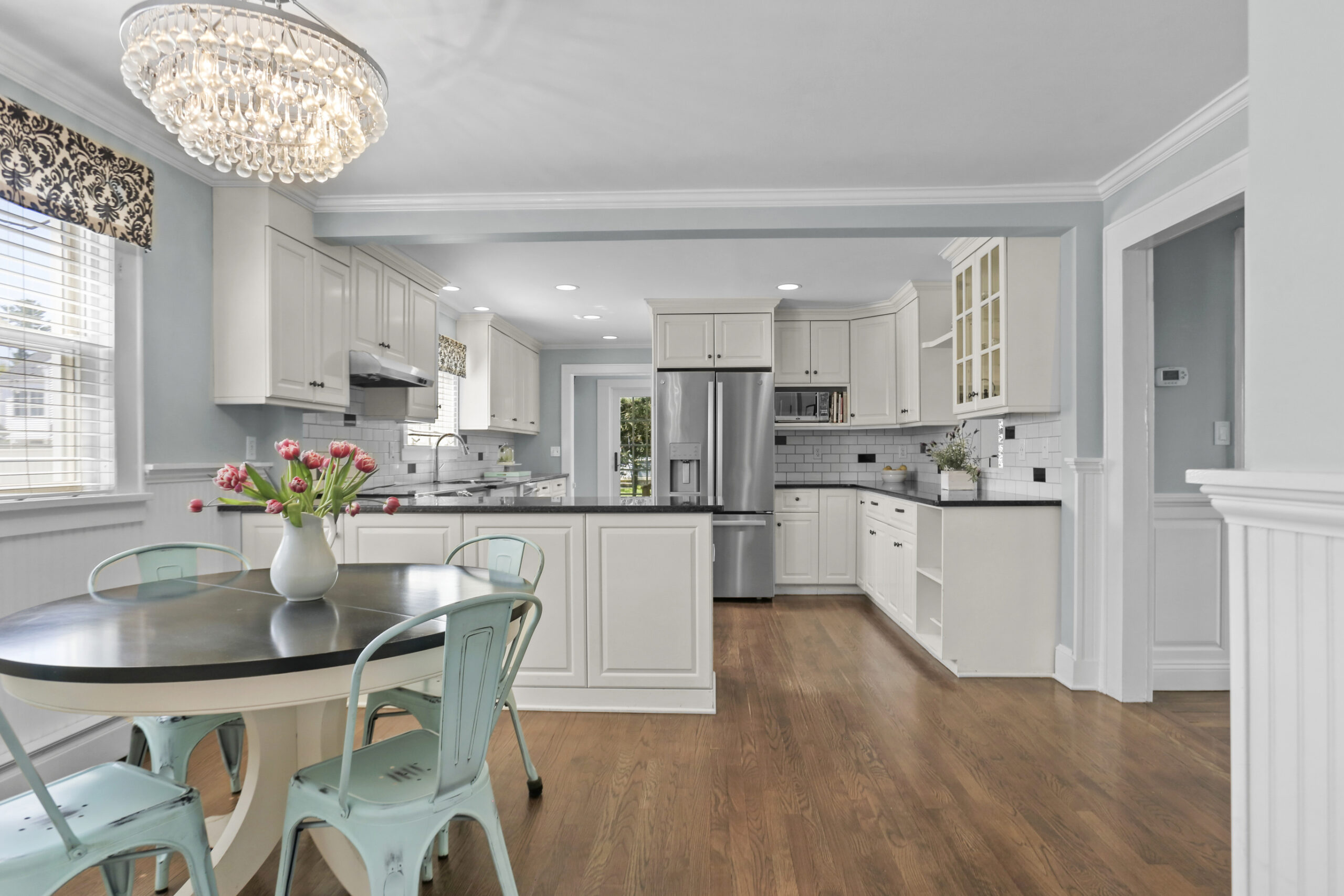 Inside, the foyer opens to an oversized living room complete with a fireplace and bay window, the perfect spot for movie night or relaxing with a good book. Just ahead, the kitchen is spacious and features a large breakfast nook. Stainless steel appliances, glass cabinets, black and white tile backsplash and wainscoting complete the kitchen. Don't miss the mudroom and a French door leading out to the backyard! Hosting dinner parties, entertaining friends and family for holiday gatherings or having quiet meals in has never been easier with the large dining room steps away, accented with moldings and a bay window. The family room is chic and cozy with French doors inviting you out to the patio and a charming window to peek into the kitchen. A half bathroom is tucked neatly in the corner.