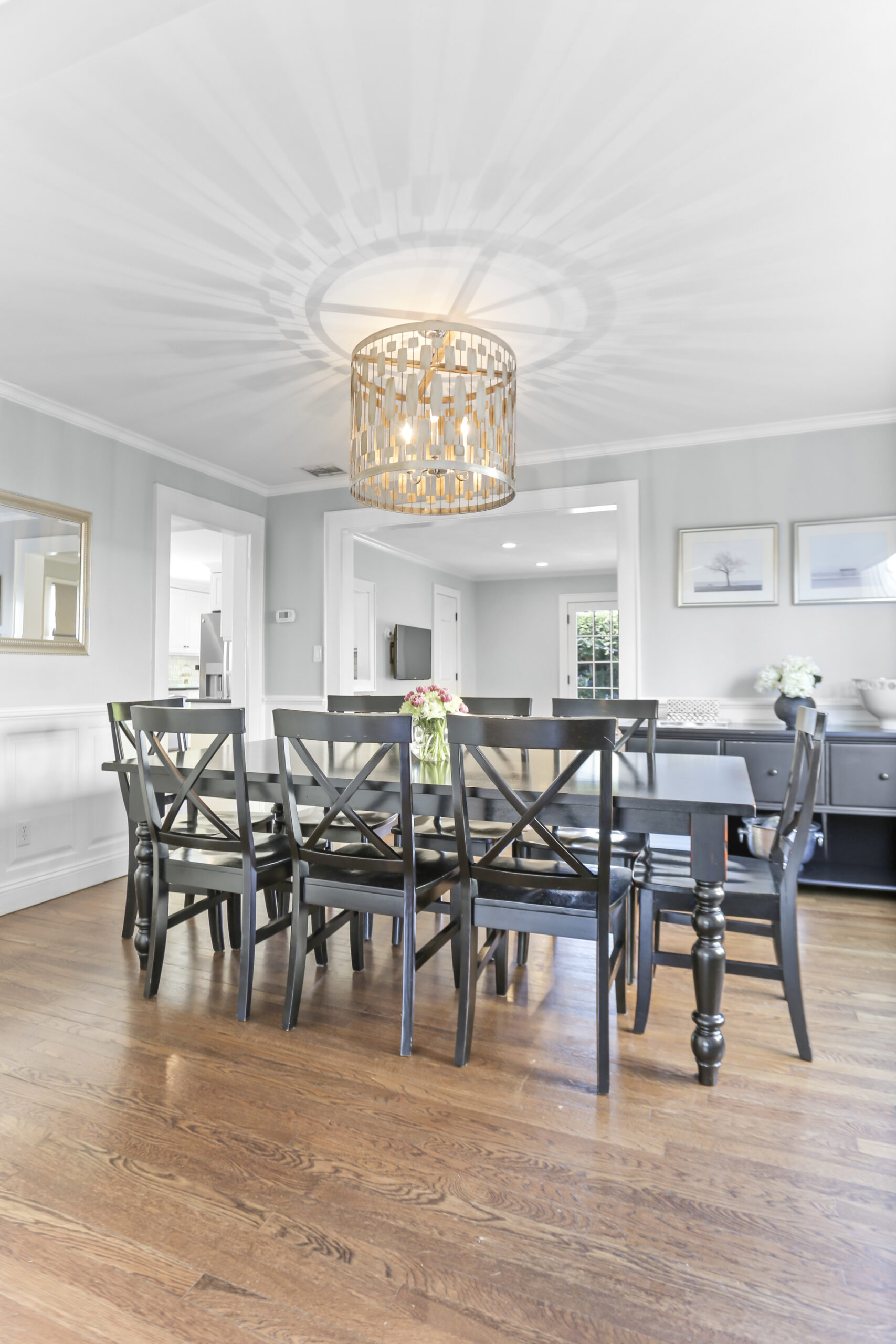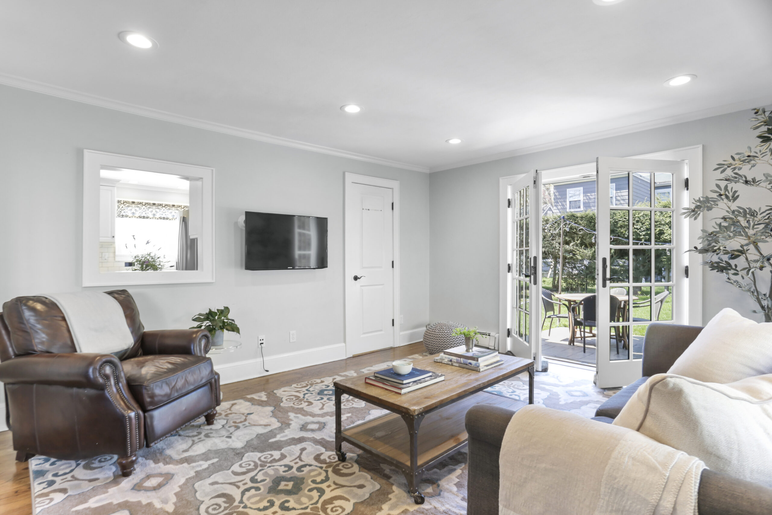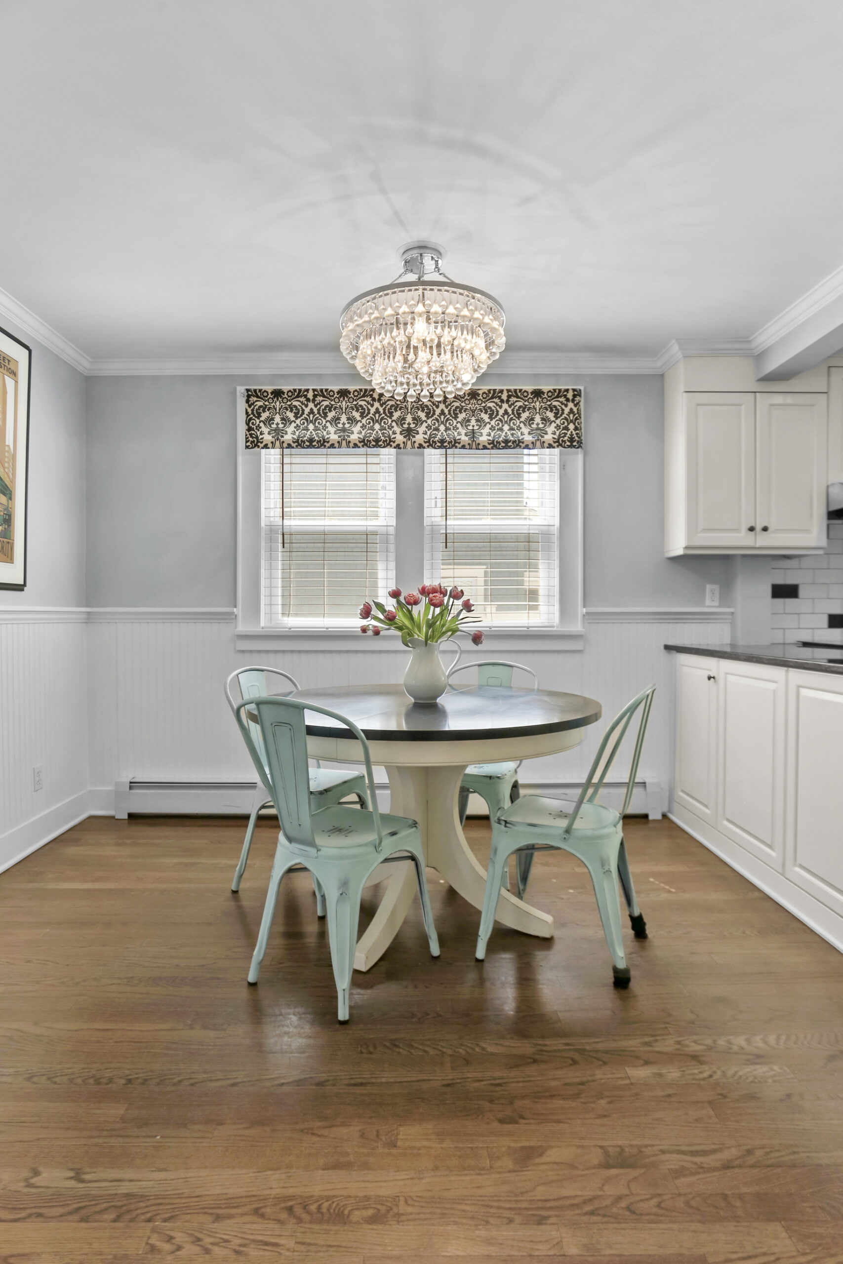 Inside, the foyer opens to an oversized living room complete with a fireplace and bay window, the perfect spot for movie night or relaxing with a good book. Just ahead, the kitchen is spacious and features a large breakfast nook. Stainless steel appliances, glass cabinets, black and white tile backsplash and wainscoting complete the kitchen. Don't miss the mudroom and a French door leading out to the backyard! Hosting dinner parties, entertaining friends and family for holiday gatherings or having quiet meals in has never been easier with the large dining room steps away, accented with moldings and a bay window. The family room is chic and cozy with French doors inviting you out to the patio and a charming window to peek into the kitchen. A half bathroom is tucked neatly in the corner.