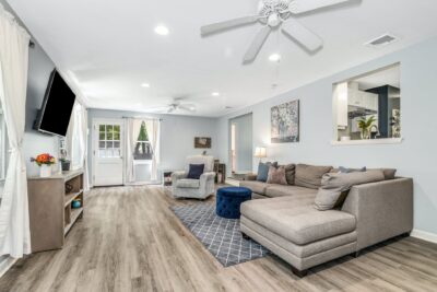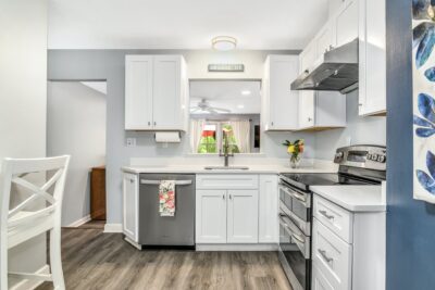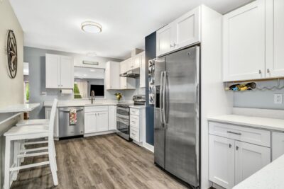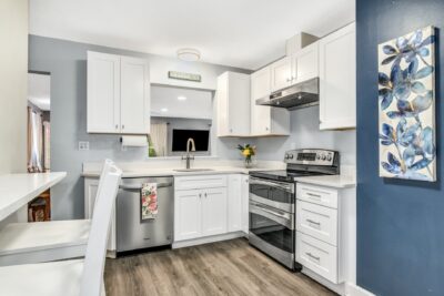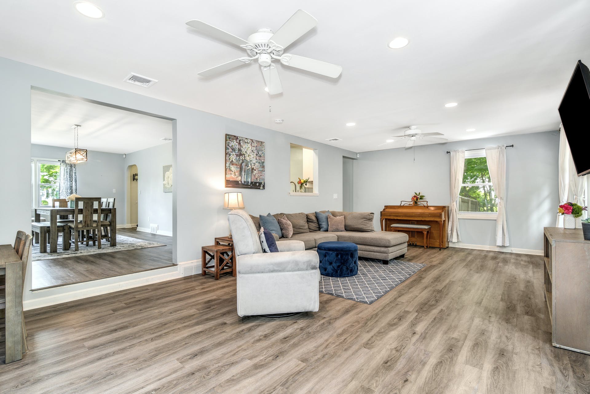 Inside you’ll find a bright and airy recently remodeled home with over 1500 square feet, 3 bedrooms, 2 full bathrooms, and new floors throughout. The oversized dining room was made for entertaining with a wide doorway inviting you to the sun-drenched living room. This incredible space is perfect for movie nights and has two doors to the back patio. A double oven, stainless steel appliances and breakfast bar make up some of the features in the new kitchen. The partially finished basement is ready for your finishing touches to provide an additional 1,200 square feet of living space.