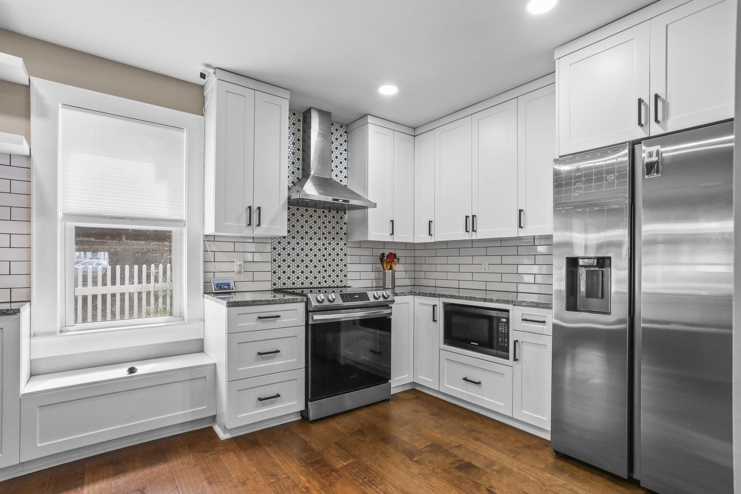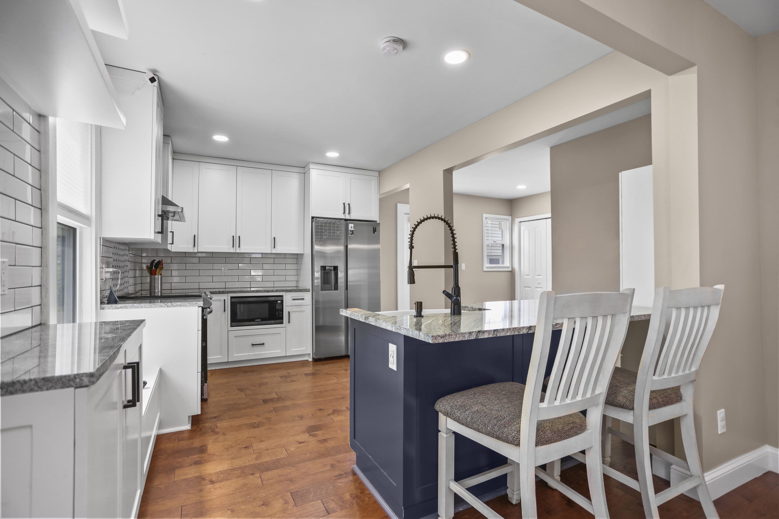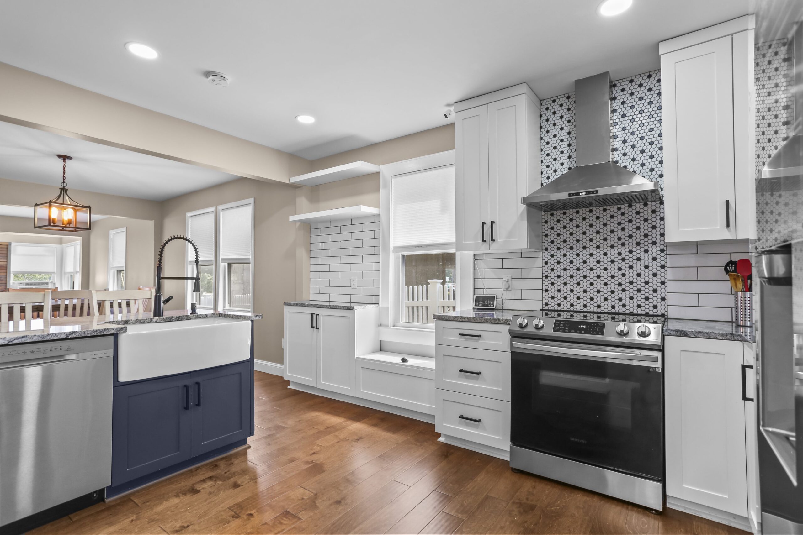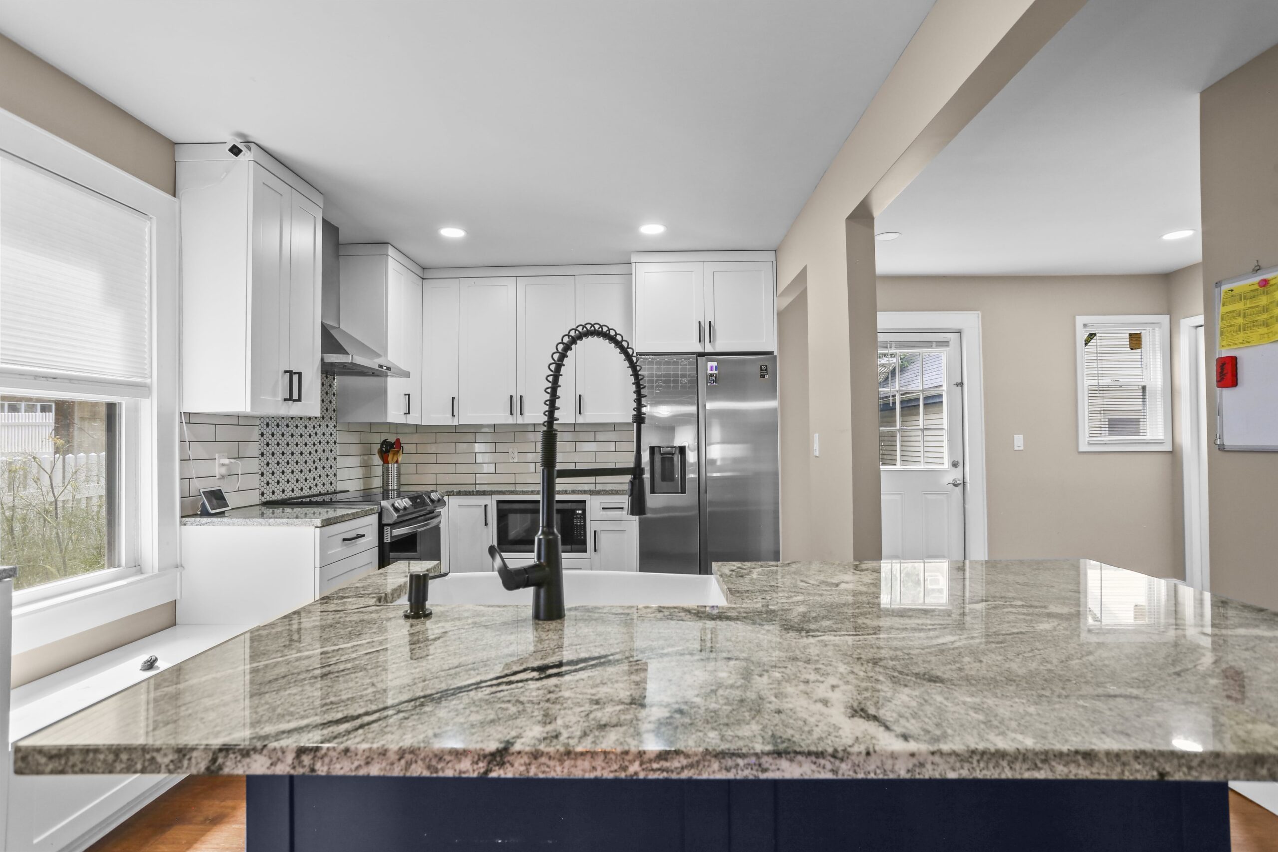 The gorgeous, renovated kitchen is sure to impress, featuring a farmhouse sink, peninsula with seating, pantry, stainless steel appliances, window seat, beautiful tile backsplash, and access to the backyard. A first-floor bedroom, full bathroom, and laundry area finish off the main level. The second floor features three bedrooms and two full bathrooms. Make your way to the large primary bedroom suite, complete with a full bathroom, amazing walk-in closet, and an office nook. The heated lower level is partially finished and is a great space for a playroom, family room, office, or gym.