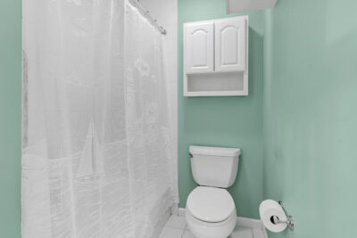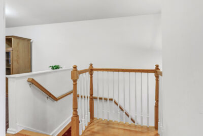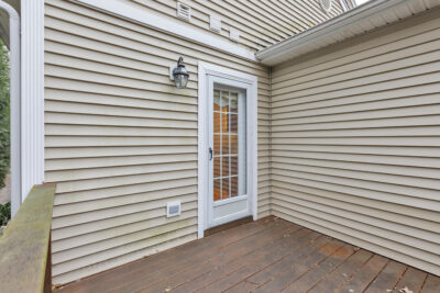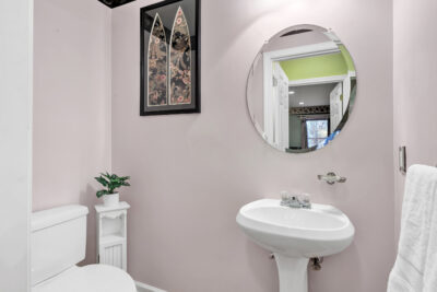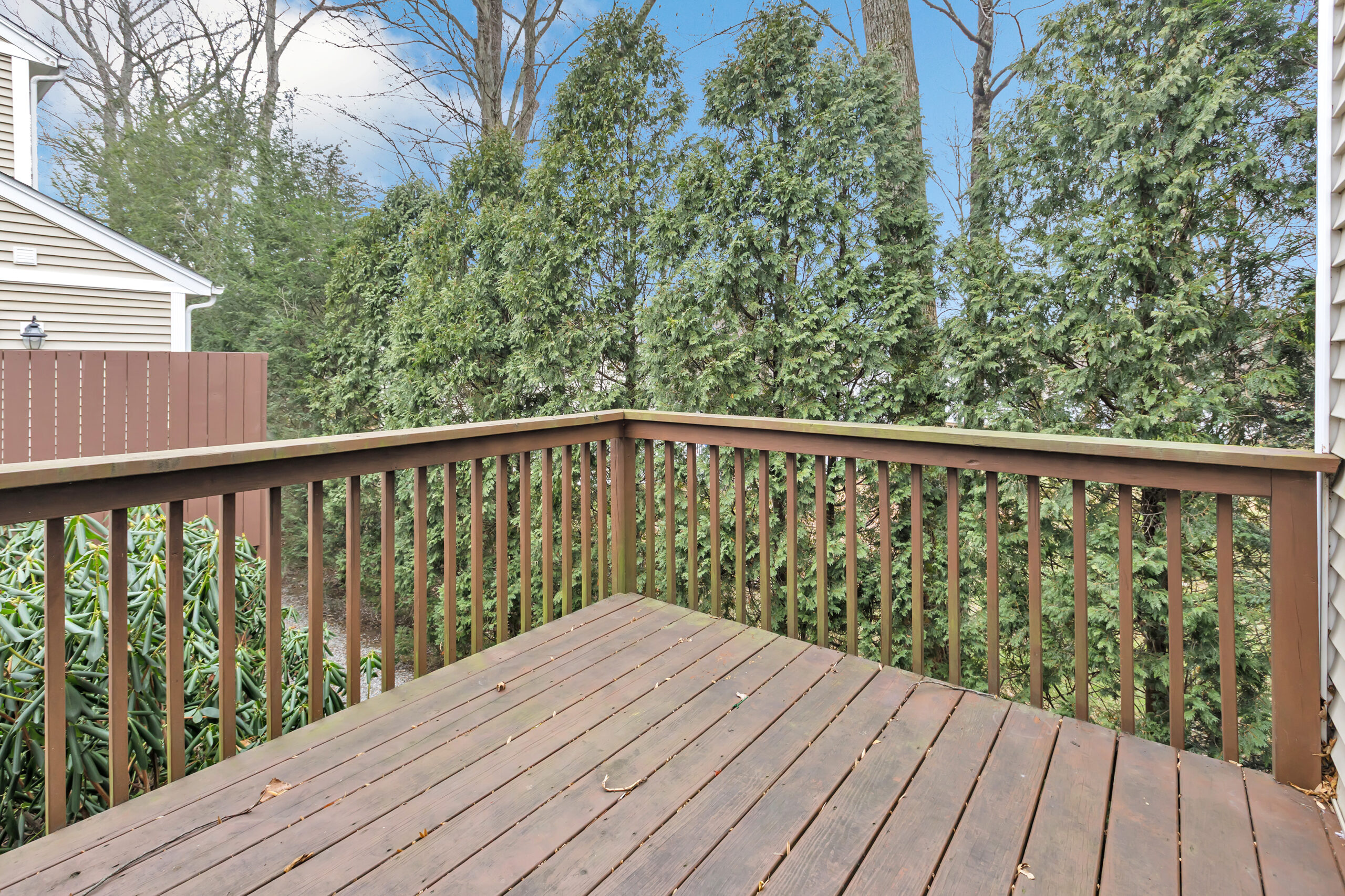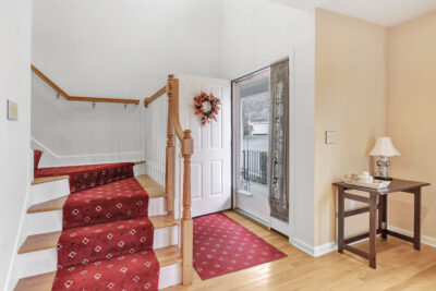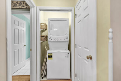 Just off the kitchen, a private deck overlooks greenery, providing a peaceful setting for morning coffee or quiet evenings outside. The main level is thoughtfully designed for everyday living, featuring a spacious primary bedroom with a full bathroom, a powder room, and a conveniently located stacked laundry closet. Ample closet space throughout the home adds to the ease and organization of the layout.
