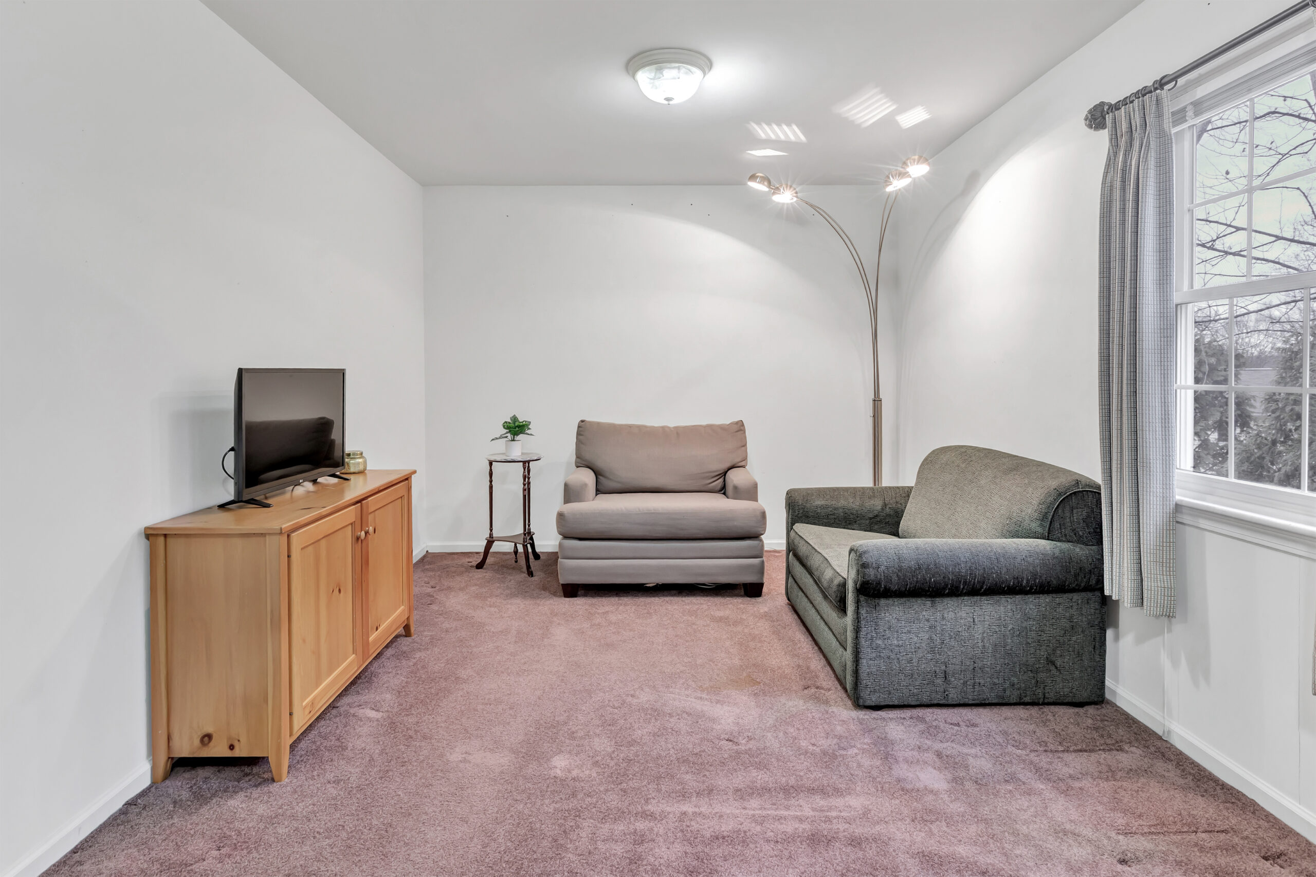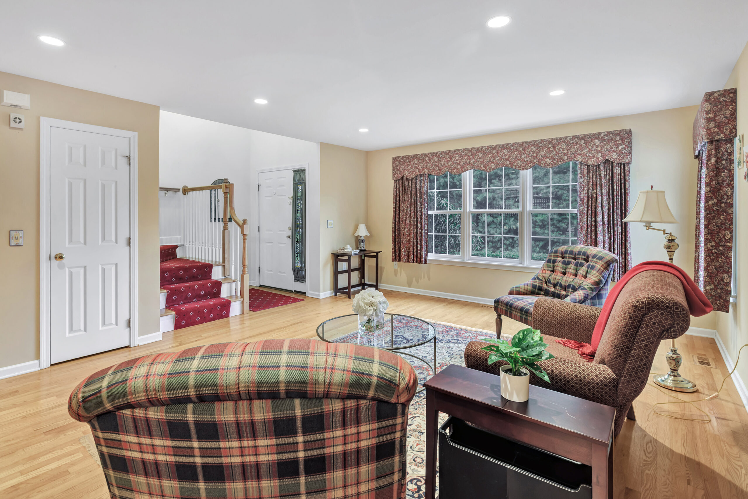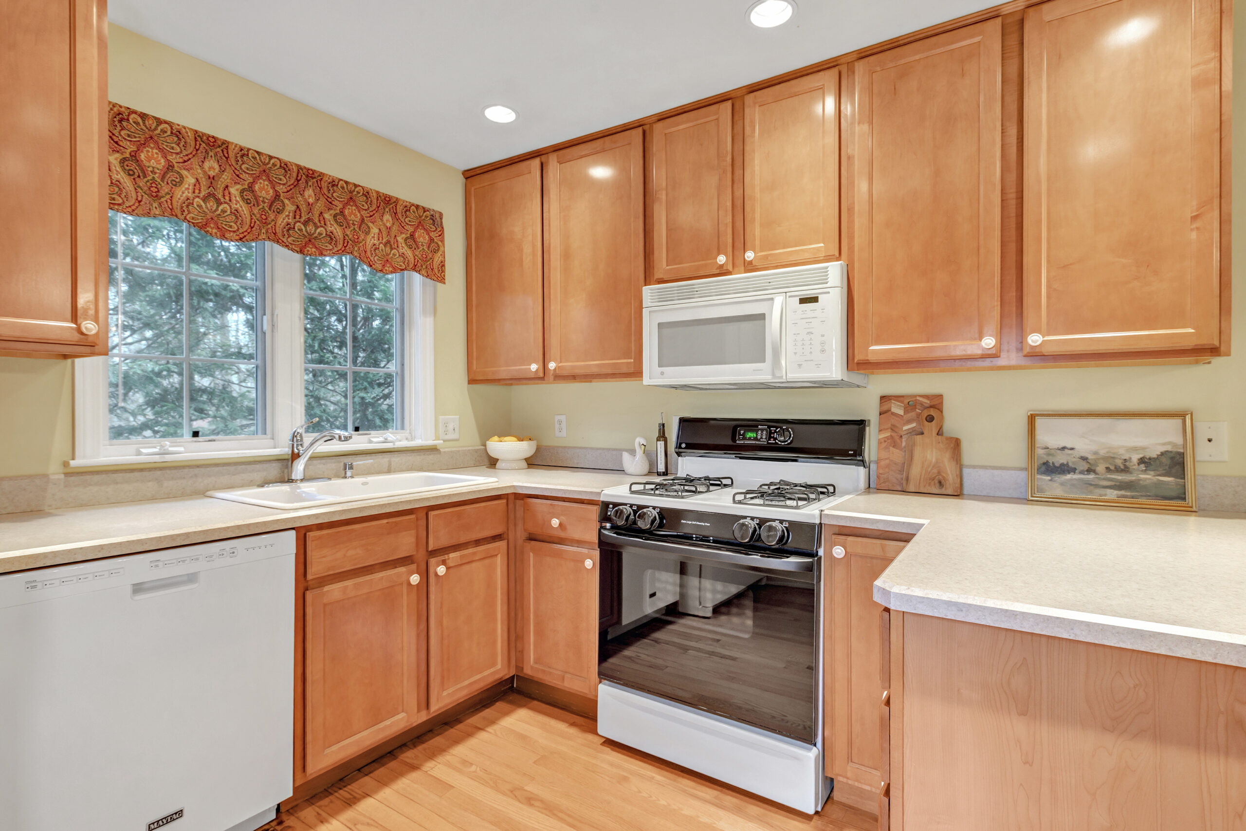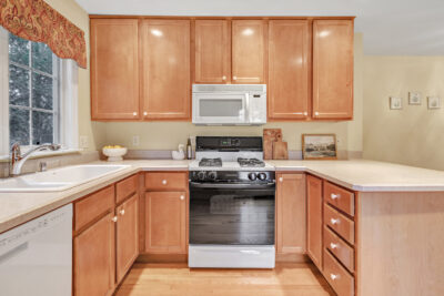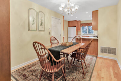 The living room flows effortlessly into the dining area and kitchen, creating an open layout that feels both comfortable and functional. Hardwood floors carry throughout the main level, connecting each space and enhancing the warm, welcoming feel of the home. In the kitchen, a breakfast bar offers casual seating, while a window over the sink looks out to a private, tree lined backdrop, bringing the outdoors in.